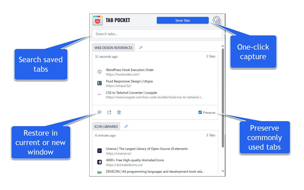 - Store Tabs instantly saves every tab in your active window into a dated “pocket.”